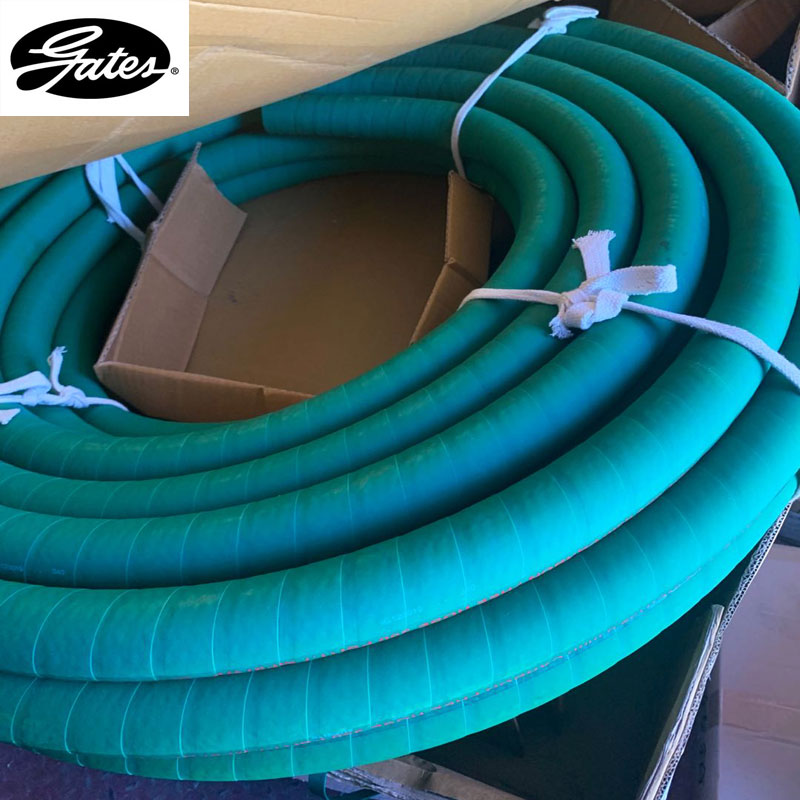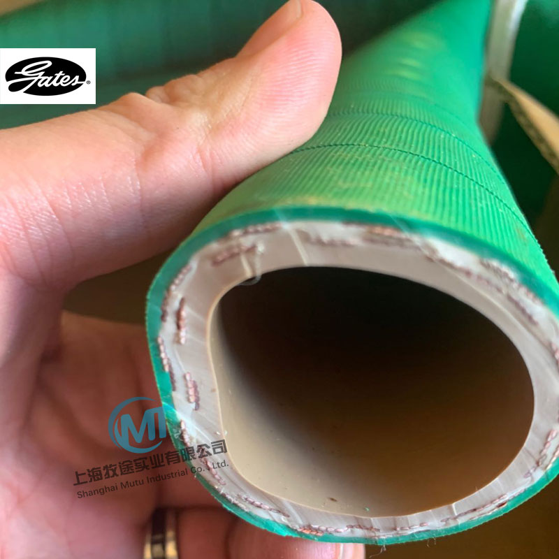 推荐用途:用于一系列化学品转运的罐式车,驳船,储存罐。Mustang 通过一层钢丝螺旋来满足完全的吸入要求,以及小弯曲半径的布线 要求。其交叉结合的改性聚乙烯内胶是目前最好的可保证与不锈钢 接头“无缝”连接的材料。其设计保证其在“开式”50psi蒸汽下 或者10%(NaOH)212˚F(100˚C)的喷淋下的清洗。必须使用在位清 洁(CIP)方式。不推荐用于“闭式蒸汽”清洗。可用于超过950种基 础化学物质,这些物质是很多工业领域合成数量众多的化学品的基 体。请参照盖茨化学介质兼容性表确定正确的软管选型。 注意事项:如需用于含超过90%硫酸的应用,请联系当地盖茨业务 代表。 温度:常规应用下-40˚F至+250˚F(-40˚C至+121˚C)。尽管 Mustang是按照使用温度250˚F(+121˚C)精心设计的,但是具体的可 使用温度还取决于输送的化学介质。用于任何高于125˚F(+52˚C)的 化学物质,请联系当地盖茨业务代表。 内胶层:K型鞣革(Gatron™改性交叉结合聚乙烯),强耐化学腐蚀。 增强层:合成高强度棉线编织及钢丝螺旋。 外胶层:P型(三元乙丙橡胶),黑色或绿色波纹状外表